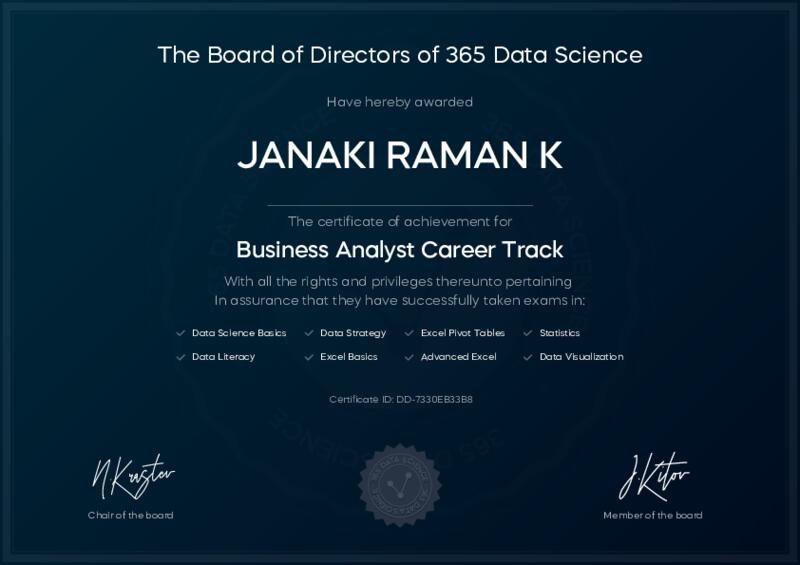 This user has been awarded the Business Analyst Career Track Certificate for successfully completing all courses and assessments. This certificate confirms their technical expertise and professional credibility to work as a business analyst.