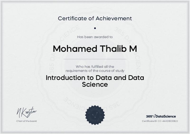 This user has been awarded the Introduction to Data and Data Science Certificate for successfully completing the course exam. Holding this certificate demonstrates their proficiency on the topic and signifies they are qualified to apply their newly acquired expertise in the fields of data analytics and data science.