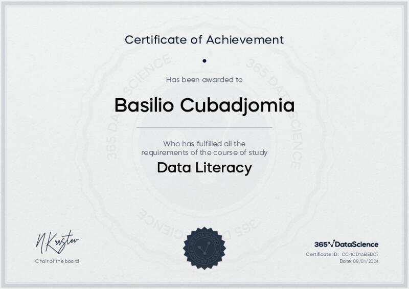 This user has been awarded the Data Literacy Certificate for successfully completing the course exam. Holding this certificate demonstrates their proficiency on the topic and signifies they are qualified to apply their newly acquired expertise in the fields of data analytics and data science.