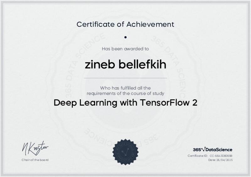 This user has been awarded the Deep Learning with TensorFlow 2 Certificate for successfully completing the course exam. Holding this certificate demonstrates their proficiency on the topic and signifies they are qualified to apply their newly acquired expertise in the fields of data analytics and data science.