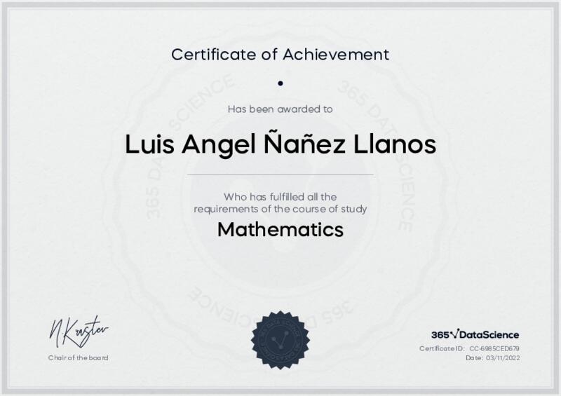 This user has been awarded the Mathematics Certificate for successfully completing the course exam. Holding this certificate demonstrates their proficiency on the topic and signifies they are qualified to apply their newly acquired expertise in the fields of data analytics and data science.