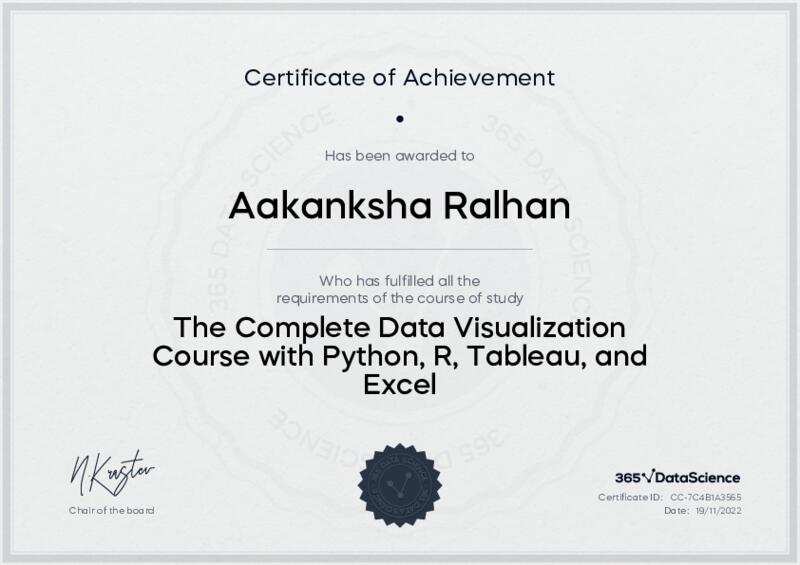 This user has been awarded the The Complete Data Visualization Course with Python, R, Tableau, and Excel Certificate for successfully completing the course exam. Holding this certificate demonstrates their proficiency on the topic and signifies they are qualified to apply their newly acquired expertise in the fields of data analytics and data science.