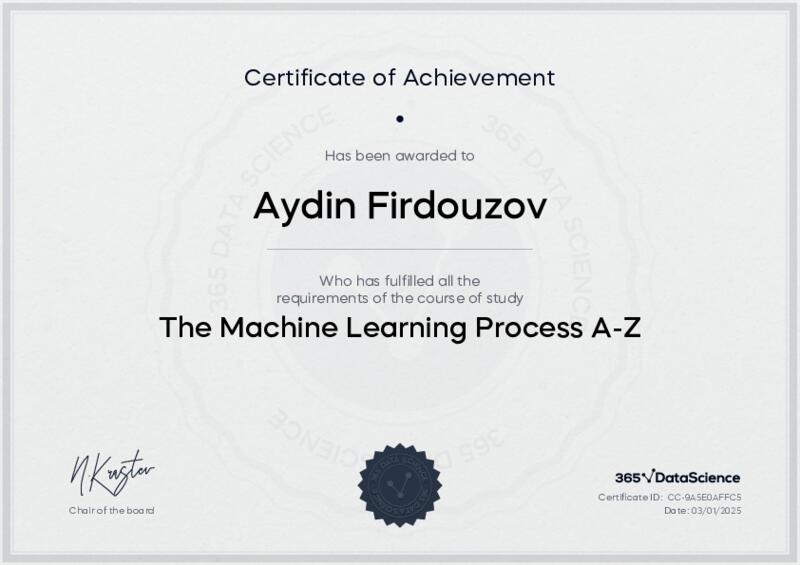 This user has been awarded the The Machine Learning Process A-Z Certificate for successfully completing the course exam. Holding this certificate demonstrates their proficiency on the topic and signifies they are qualified to apply their newly acquired expertise in the fields of data analytics and data science.