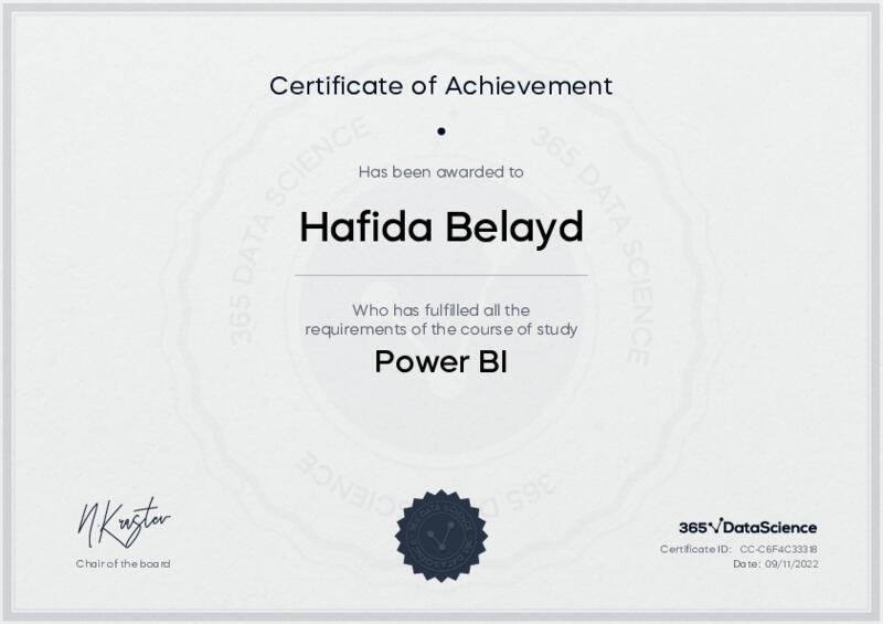 This user has been awarded the Power BI Certificate for successfully completing the course exam. Holding this certificate demonstrates their proficiency on the topic and signifies they are qualified to apply their newly acquired expertise in the fields of data analytics and data science.