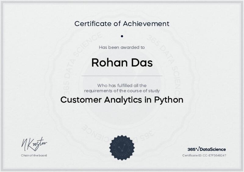This user has been awarded the Customer Analytics in Python Certificate for successfully completing the course exam. Holding this certificate demonstrates their proficiency on the topic and signifies they are qualified to apply their newly acquired expertise in the fields of data analytics and data science.