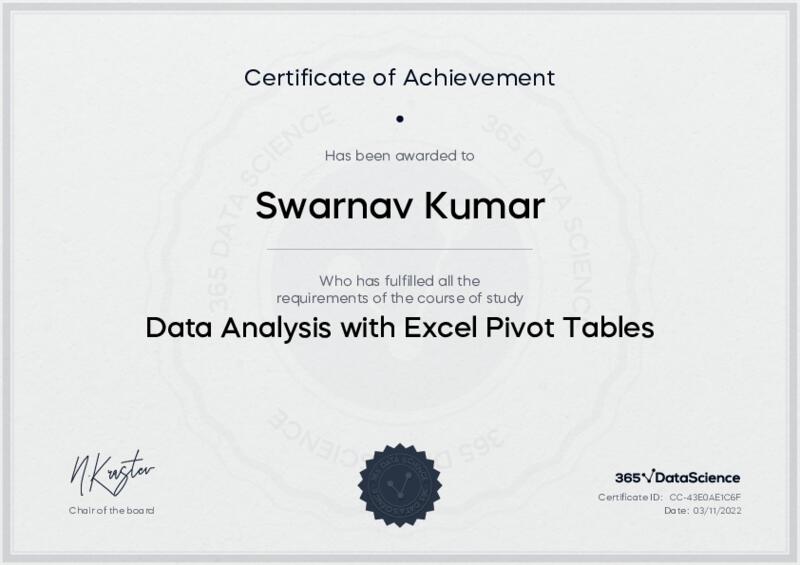 This user has been awarded the Data Analysis with Excel Pivot Tables Certificate for successfully completing the course exam. Holding this certificate demonstrates their proficiency on the topic and signifies they are qualified to apply their newly acquired expertise in the fields of data analytics and data science.