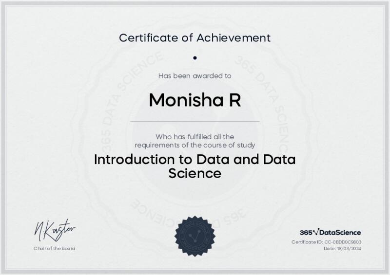 This user has been awarded the Introduction to Data and Data Science Certificate for successfully completing the course exam. Holding this certificate demonstrates their proficiency on the topic and signifies they are qualified to apply their newly acquired expertise in the fields of data analytics and data science.