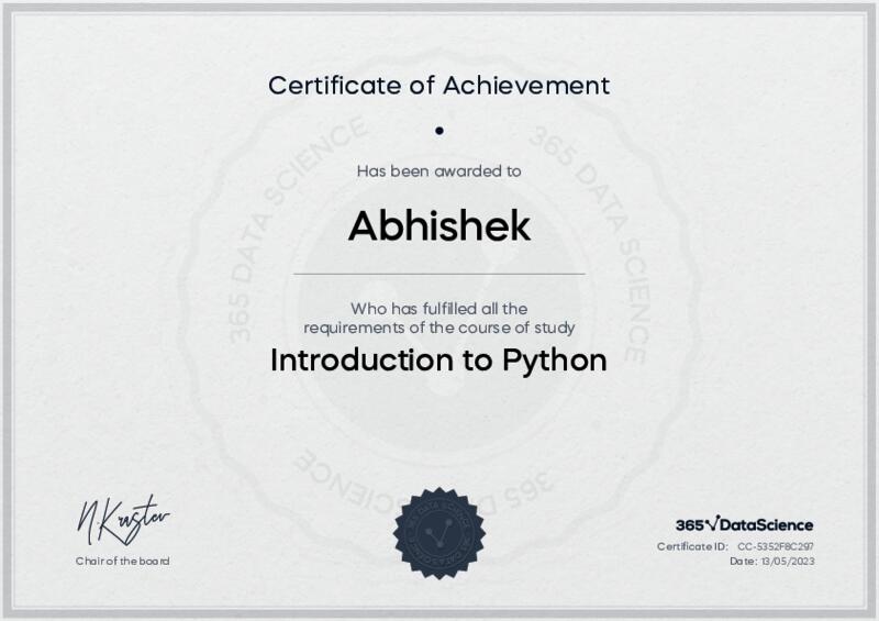 This user has been awarded the Introduction to Python Certificate for successfully completing the course exam. Holding this certificate demonstrates their proficiency on the topic and signifies they are qualified to apply their newly acquired expertise in the fields of data analytics and data science.