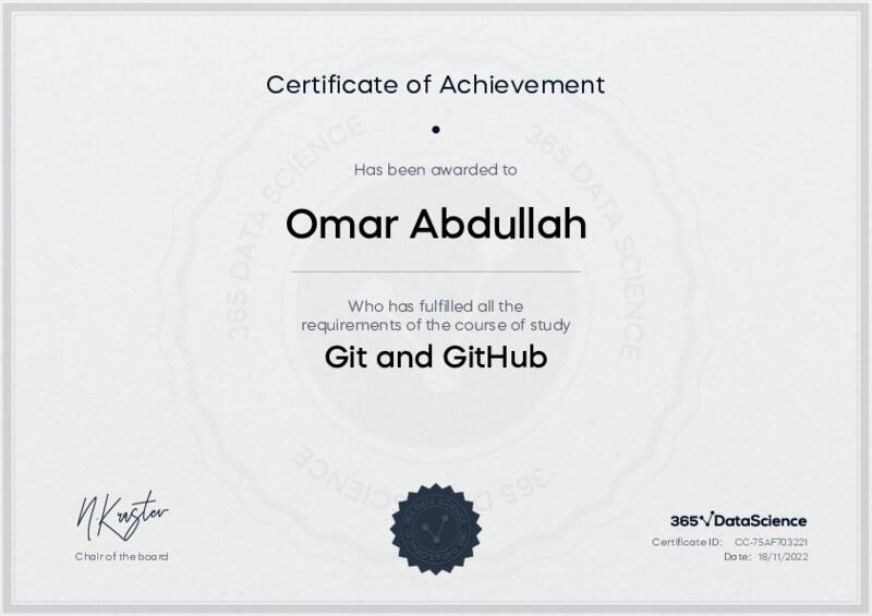 This user has been awarded the Git and GitHub Certificate for successfully completing the course exam. Holding this certificate demonstrates their proficiency on the topic and signifies they are qualified to apply their newly acquired expertise in the fields of data analytics and data science.