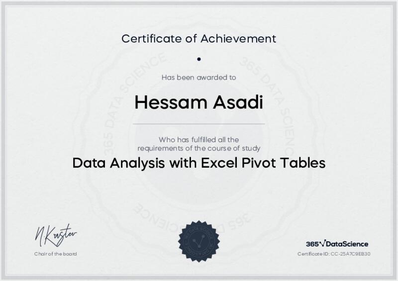 This user has been awarded the Data Analysis with Excel Pivot Tables Certificate for successfully completing the course exam. Holding this certificate demonstrates their proficiency on the topic and signifies they are qualified to apply their newly acquired expertise in the fields of data analytics and data science.