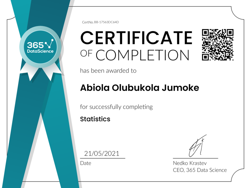 Congratulations! You have been awarded the 365 Data Science Certificate for successfully completing this course. Holding this certificate demonstrates your proficiency on the topic and your ability to apply your newly acquired expertise in the fields of data analytics and data science with confidence.