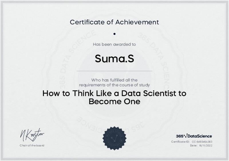 This user has been awarded the How to Think Like a Data Scientist to Become One Certificate for successfully completing the course exam. Holding this certificate demonstrates their proficiency on the topic and signifies they are qualified to apply their newly acquired expertise in the fields of data analytics and data science.