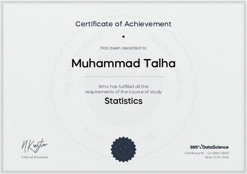 This user has been awarded the Statistics Certificate for successfully completing the course exam. Holding this certificate demonstrates their proficiency on the topic and signifies they are qualified to apply their newly acquired expertise in the fields of data analytics and data science.