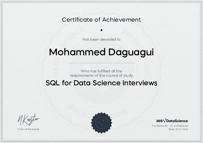 This user has been awarded the SQL for Data Science Interviews Certificate for successfully completing the course exam. Holding this certificate demonstrates their proficiency on the topic and signifies they are qualified to apply their newly acquired expertise in the fields of data analytics and data science.