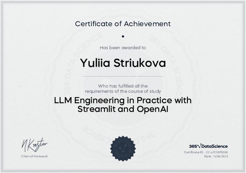 This user has been awarded the LLM Engineering in Practice with Streamlit and OpenAI Certificate for successfully completing the course exam. Holding this certificate demonstrates their proficiency on the topic and signifies they are qualified to apply their newly acquired expertise in the fields of data analytics and data science.
