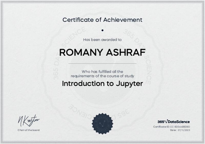 This user has been awarded the Introduction to Jupyter Certificate for successfully completing the course exam. Holding this certificate demonstrates their proficiency on the topic and signifies they are qualified to apply their newly acquired expertise in the fields of data analytics and data science.