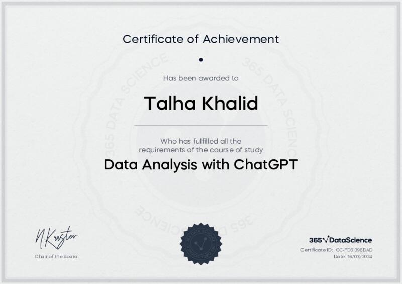 This user has been awarded the Data Analysis with ChatGPT Certificate for successfully completing the course exam. Holding this certificate demonstrates their proficiency on the topic and signifies they are qualified to apply their newly acquired expertise in the fields of data analytics and data science.