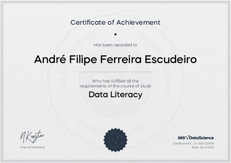 This user has been awarded the Data Literacy Certificate for successfully completing the course exam. Holding this certificate demonstrates their proficiency on the topic and signifies they are qualified to apply their newly acquired expertise in the fields of data analytics and data science.