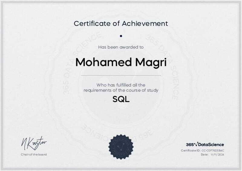 This user has been awarded the SQL Certificate for successfully completing the course exam. Holding this certificate demonstrates their proficiency on the topic and signifies they are qualified to apply their newly acquired expertise in the fields of data analytics and data science.