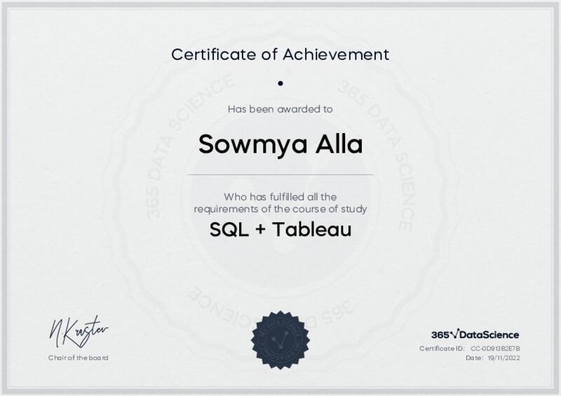 This user has been awarded the SQL + Tableau Certificate for successfully completing the course exam. Holding this certificate demonstrates their proficiency on the topic and signifies they are qualified to apply their newly acquired expertise in the fields of data analytics and data science.