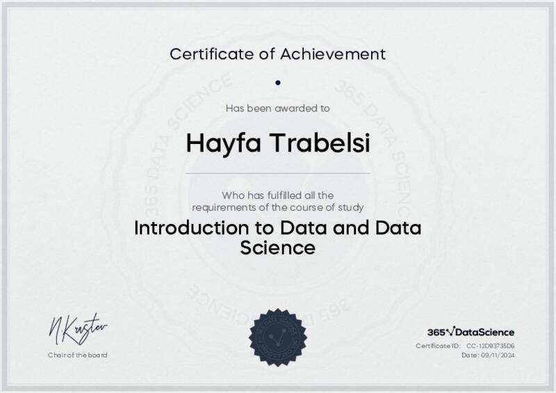 This user has been awarded the Introduction to Data and Data Science Certificate for successfully completing the course exam. Holding this certificate demonstrates their proficiency on the topic and signifies they are qualified to apply their newly acquired expertise in the fields of data analytics and data science.