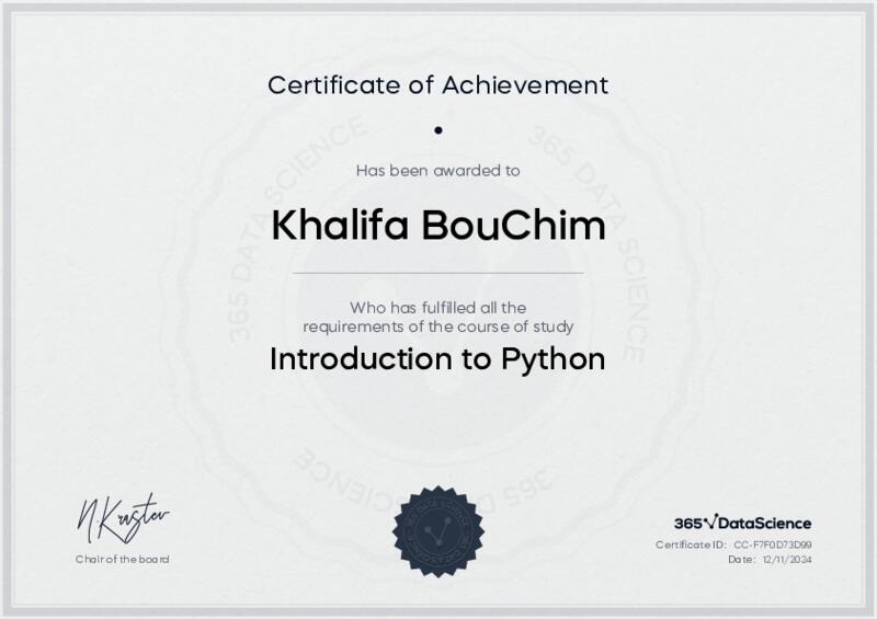 This user has been awarded the Introduction to Python Certificate for successfully completing the course exam. Holding this certificate demonstrates their proficiency on the topic and signifies they are qualified to apply their newly acquired expertise in the fields of data analytics and data science.