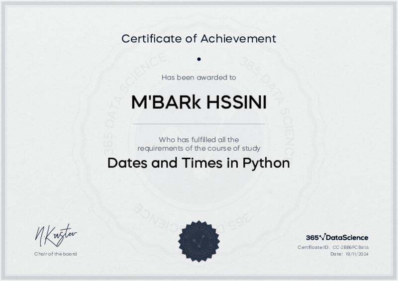 This user has been awarded the Dates and Times in Python Certificate for successfully completing the course exam. Holding this certificate demonstrates their proficiency on the topic and signifies they are qualified to apply their newly acquired expertise in the fields of data analytics and data science.