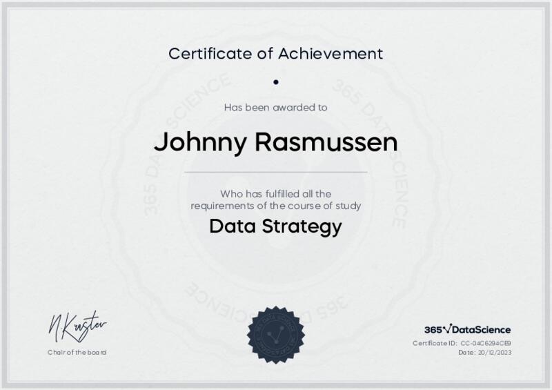 This user has been awarded the Data Strategy Certificate for successfully completing the course exam. Holding this certificate demonstrates their proficiency on the topic and signifies they are qualified to apply their newly acquired expertise in the fields of data analytics and data science.