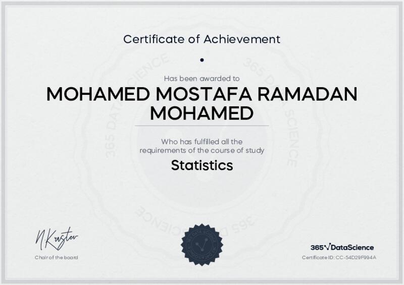 This user has been awarded the Statistics Certificate for successfully completing the course exam. Holding this certificate demonstrates their proficiency on the topic and signifies they are qualified to apply their newly acquired expertise in the fields of data analytics and data science.