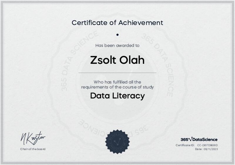 This user has been awarded the Data Literacy Certificate for successfully completing the course exam. Holding this certificate demonstrates their proficiency on the topic and signifies they are qualified to apply their newly acquired expertise in the fields of data analytics and data science.