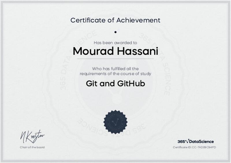 This user has been awarded the Git and GitHub Certificate for successfully completing the course exam. Holding this certificate demonstrates their proficiency on the topic and signifies they are qualified to apply their newly acquired expertise in the fields of data analytics and data science.