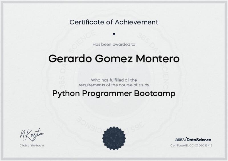 This user has been awarded the Python Programmer Bootcamp Certificate for successfully completing the course exam. Holding this certificate demonstrates their proficiency on the topic and signifies they are qualified to apply their newly acquired expertise in the fields of data analytics and data science.