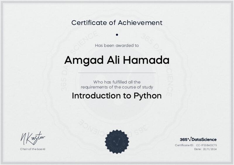 This user has been awarded the Introduction to Python Certificate for successfully completing the course exam. Holding this certificate demonstrates their proficiency on the topic and signifies they are qualified to apply their newly acquired expertise in the fields of data analytics and data science.