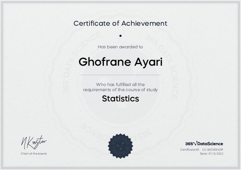 This user has been awarded the Statistics Certificate for successfully completing the course exam. Holding this certificate demonstrates their proficiency on the topic and signifies they are qualified to apply their newly acquired expertise in the fields of data analytics and data science.
