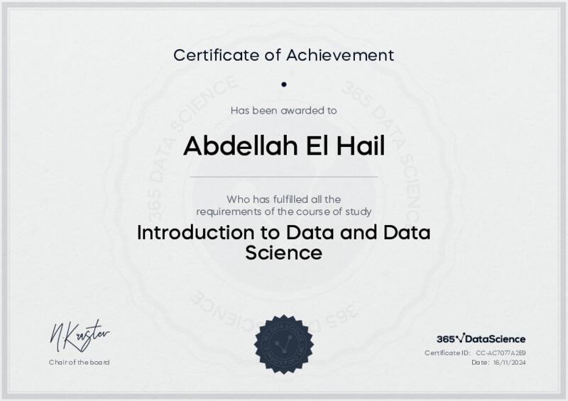 This user has been awarded the Introduction to Data and Data Science Certificate for successfully completing the course exam. Holding this certificate demonstrates their proficiency on the topic and signifies they are qualified to apply their newly acquired expertise in the fields of data analytics and data science.