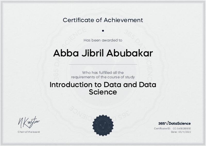 This user has been awarded the Introduction to Data and Data Science Certificate for successfully completing the course exam. Holding this certificate demonstrates their proficiency on the topic and signifies they are qualified to apply their newly acquired expertise in the fields of data analytics and data science.