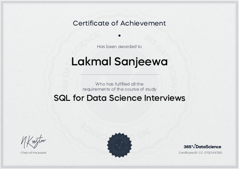 This user has been awarded the SQL for Data Science Interviews Certificate for successfully completing the course exam. Holding this certificate demonstrates their proficiency on the topic and signifies they are qualified to apply their newly acquired expertise in the fields of data analytics and data science.