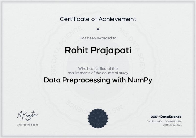 This user has been awarded the Data Preprocessing with NumPy Certificate for successfully completing the course exam. Holding this certificate demonstrates their proficiency on the topic and signifies they are qualified to apply their newly acquired expertise in the fields of data analytics and data science.