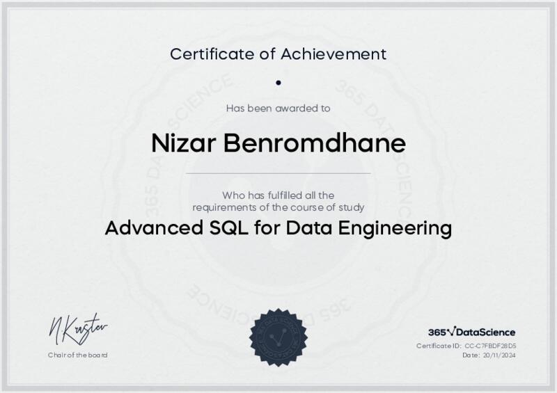 This user has been awarded the Advanced SQL for Data Engineering Certificate for successfully completing the course exam. Holding this certificate demonstrates their proficiency on the topic and signifies they are qualified to apply their newly acquired expertise in the fields of data analytics and data science.