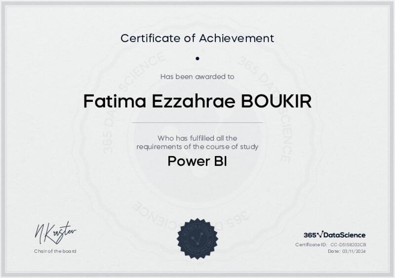 This user has been awarded the Power BI Certificate for successfully completing the course exam. Holding this certificate demonstrates their proficiency on the topic and signifies they are qualified to apply their newly acquired expertise in the fields of data analytics and data science.