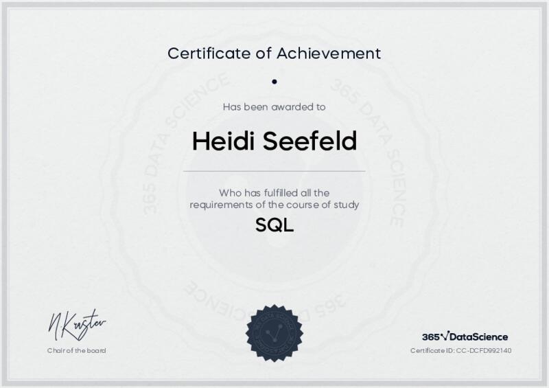 This user has been awarded the SQL Certificate for successfully completing the course exam. Holding this certificate demonstrates their proficiency on the topic and signifies they are qualified to apply their newly acquired expertise in the fields of data analytics and data science.
