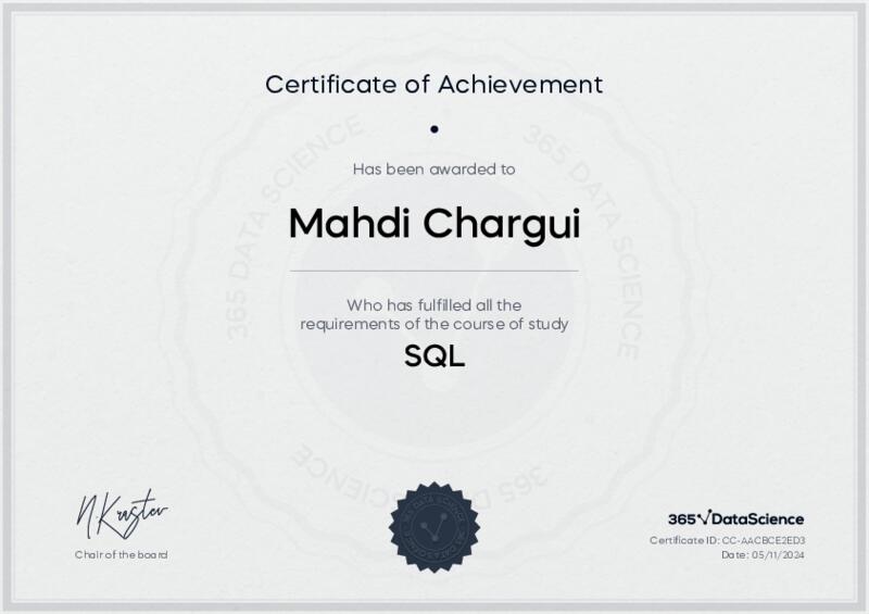 This user has been awarded the SQL Certificate for successfully completing the course exam. Holding this certificate demonstrates their proficiency on the topic and signifies they are qualified to apply their newly acquired expertise in the fields of data analytics and data science.