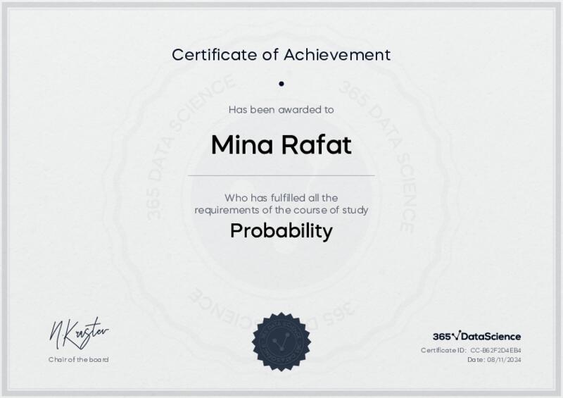 This user has been awarded the Probability Certificate for successfully completing the course exam. Holding this certificate demonstrates their proficiency on the topic and signifies they are qualified to apply their newly acquired expertise in the fields of data analytics and data science.
