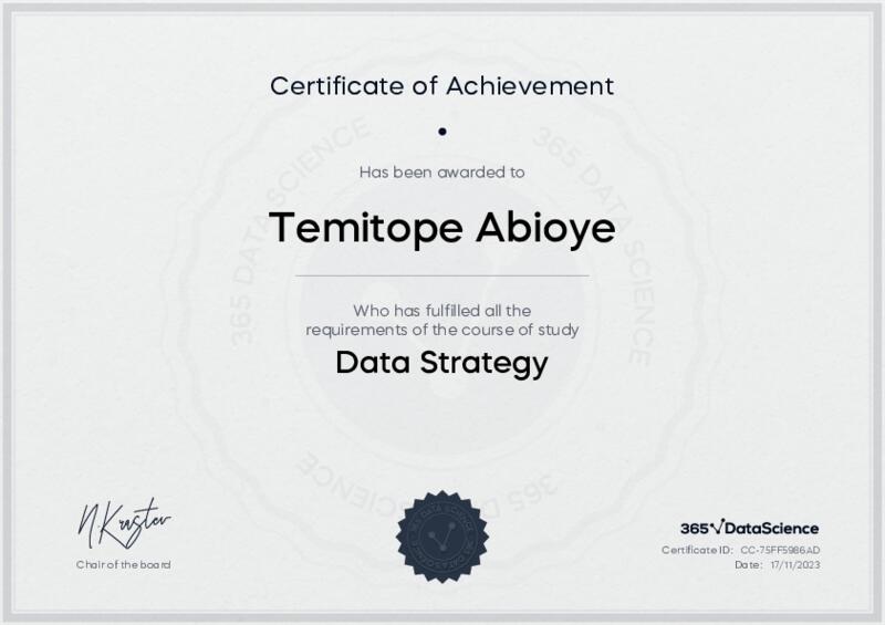 This user has been awarded the Data Strategy Certificate for successfully completing the course exam. Holding this certificate demonstrates their proficiency on the topic and signifies they are qualified to apply their newly acquired expertise in the fields of data analytics and data science.