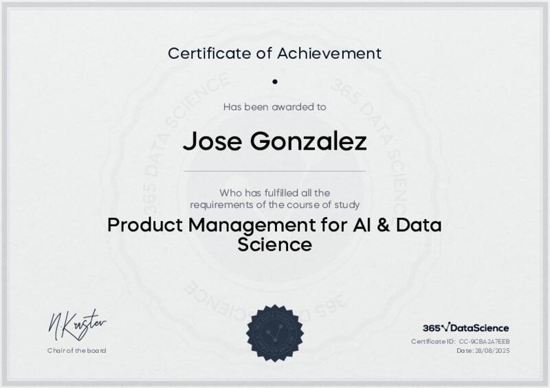 This user has been awarded the Product Management for AI & Data Science Certificate for successfully completing the course exam. Holding this certificate demonstrates their proficiency on the topic and signifies they are qualified to apply their newly acquired expertise in the fields of data analytics and data science.