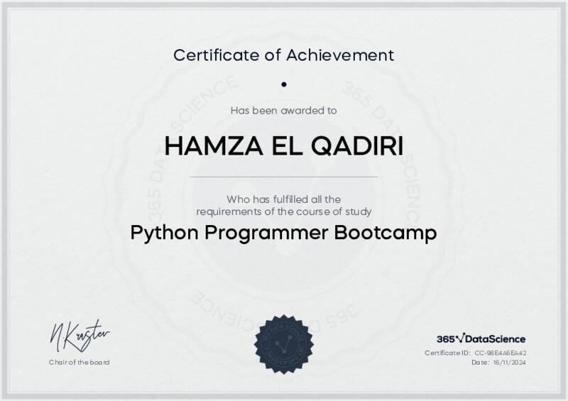 This user has been awarded the Python Programmer Bootcamp Certificate for successfully completing the course exam. Holding this certificate demonstrates their proficiency on the topic and signifies they are qualified to apply their newly acquired expertise in the fields of data analytics and data science.