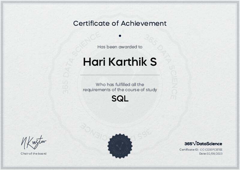 This user has been awarded the SQL Certificate for successfully completing the course exam. Holding this certificate demonstrates their proficiency on the topic and signifies they are qualified to apply their newly acquired expertise in the fields of data analytics and data science.