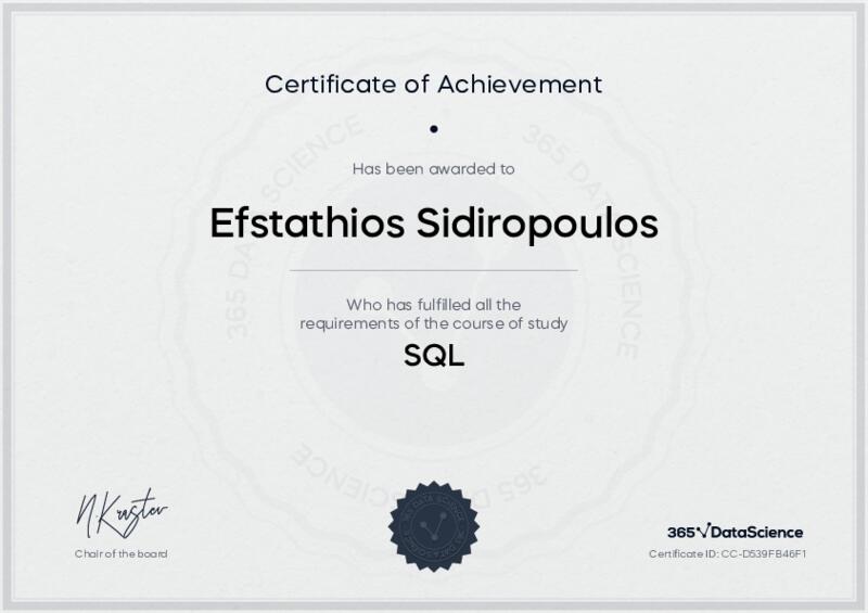 This user has been awarded the SQL Certificate for successfully completing the course exam. Holding this certificate demonstrates their proficiency on the topic and signifies they are qualified to apply their newly acquired expertise in the fields of data analytics and data science.