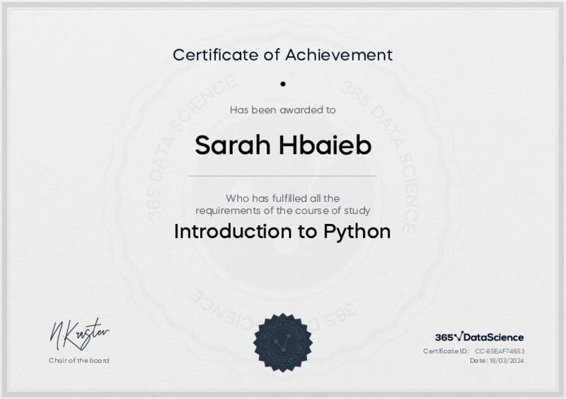 This user has been awarded the Introduction to Python Certificate for successfully completing the course exam. Holding this certificate demonstrates their proficiency on the topic and signifies they are qualified to apply their newly acquired expertise in the fields of data analytics and data science.