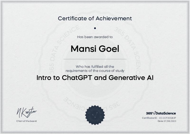 This user has been awarded the Intro to ChatGPT and Generative AI Certificate for successfully completing the course exam. Holding this certificate demonstrates their proficiency on the topic and signifies they are qualified to apply their newly acquired expertise in the fields of data analytics and data science.